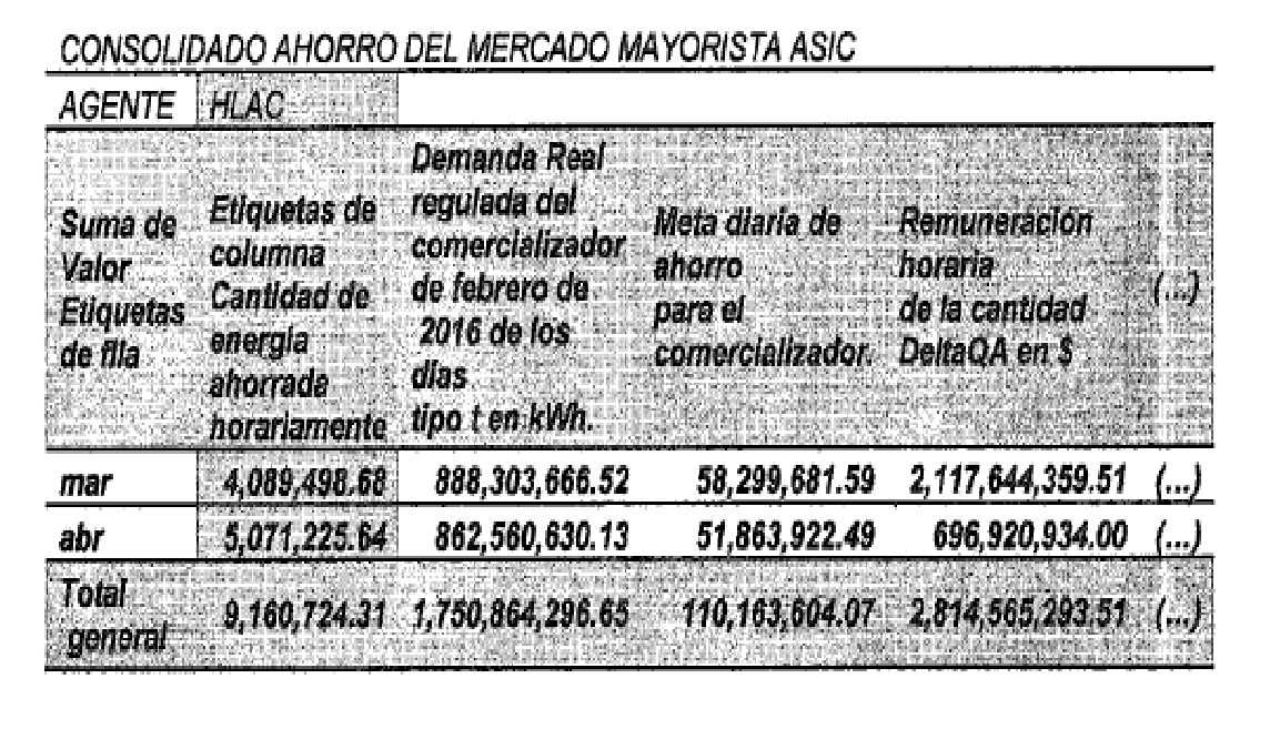 De igual manera se realizaron pruebas de cumplimiento sobre el balance total de energía, es decir sobre la diferencia entre el ahorro total neto de energía sobre la diferencia entre el ahorro total neto de energía en el mercado minorista menos el ahorno del comercializador en el mercado mayorista, lo cual se encontró en concordancia con el numeral 1 y el numeral 2 del artículo 5 de la resolución CREG 029 de 2016. Lo que dio como resultado lo siguiente: (SIC)