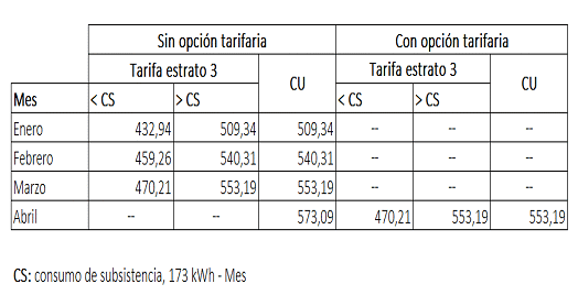 - Se establece la aplicación obligatoria de una opción tarifaria desde la expedición de la Resolución, para que los incrementos que se den en el costo unitario de prestación del servicio, CU, de mayo, junio y julio, se apliquen sólo a partir del mes de agosto de este año.