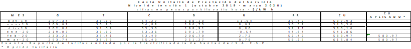 En el siguiente cuadro encontrará el costo unitario de prestación del servicio de nivel de tensión 1, discriminado por componente, reportado por la Electrificadora de Santander S.A. E.S.P., entre octubre de 2019 y marzo de 2020, igual a las tarifas del servicio aplicables a los usuarios residenciales de estrato 4: