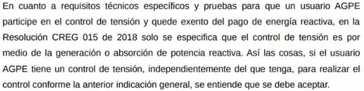 2. Que en Concepto 3858 de septiembre 8 de 2021 la CREG ratifico que los AGPE podían hacer parte del control de tensión en coordinación con el Operador de red.