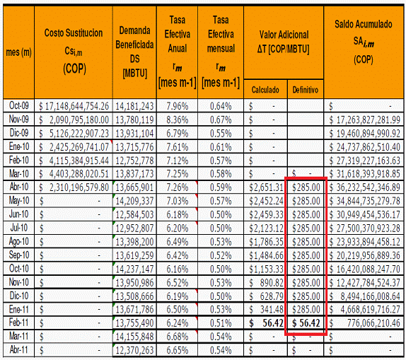 Nótese que los valores del incremento (resaltados en rojo) comienzan a partir de Abril de 2010 y terminan en febrero de 2011, y son iguales a 285 $/MBTU exceptuando el último mes, en donde el incremento es igual a 56.42 $/kWh.