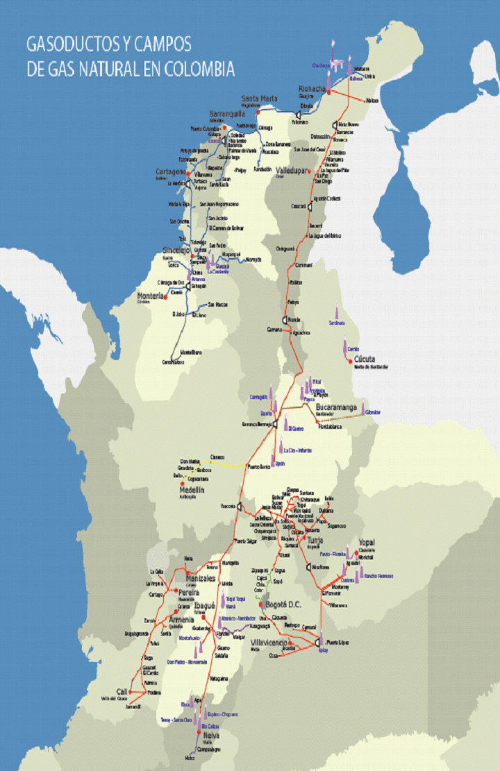 El gas natural en el país se obtiene principalmente de los campos de producción Ballena y Chuchupa en La Guajira (60% de la producción nacional) y del campo de producción Cusiana en el Casanare (27% de la producción nacional).