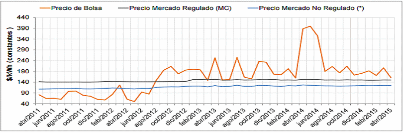 Figura 1. Precio de bolsa y contratos por tipo de mercado. Fuente XM abril 2015
