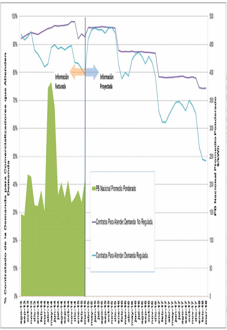 El la figura 1 se presenta el comportamiento de los precios de bolsa y los precios de los contratos pactados por los agentes en el mercado no regulado y regulado.