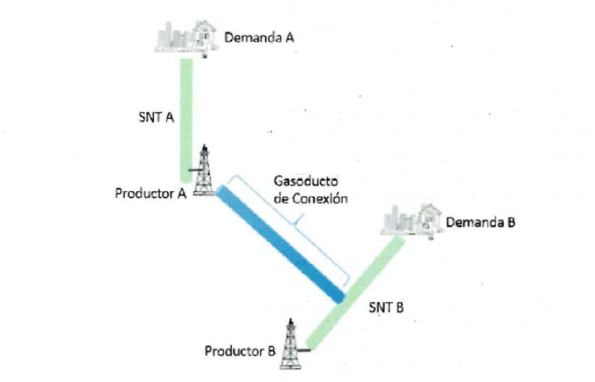 Como puede evidenciarse en el diagrama, si el trazado sólo se refiere a la distancia entre el Productor A y el SNT B (azul), en ese fragmento no hay conexión de usuarios regulados y no aplicaría lo establecido en el artículo 14, sin embargo es claro que la intención de este gasoducto de conexión es llevar el gas del Productor A hasta la Demanda B, en donde la demanda regulada puede ser superior al 10% de la CMMP del gasoducto de conexión (azul), situación en la que debe ser escindido del productor y el servicio prestarse a través de un transportador. Se solicita al Regulador aclarar que el trazado debe considerarse desde el pozo hasta el sitio de demanda que va a ser atendida con dicho gas.”