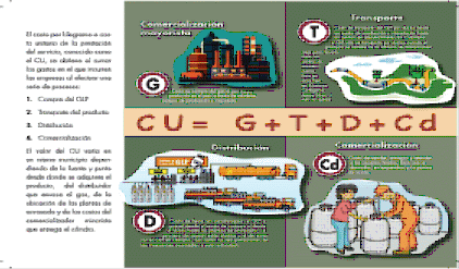 | Costo Unitario de Prestación del Servicio (pesos por kilogramo - $/kg.) Para los usuarios finales. Cuando el servicio se presta en cilindros, este costo unitario se multiplica por la cantidad de kilogramos de gas que contienen las diferentes denominaciones de dichos cilindros. Por ejemplo, para determinar el precio final del cilindro de 40 libras, el Cu se multiplica por su equivalente en kilogramos, es decir 18 kilogramos (se resta el peso del cilindro).Este valor del Cu puede variar mensualmente según varíen los componentes G, T, D y Cd de la fórmula. | |
