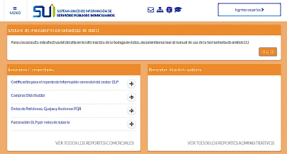 El acceso a la información lo puede hacer ingresando a la página web del SUI www.sui.gov.co y luego a las consultas relacionadas con el servicio de GLP (a través de un icono en forma de cilindro), y luego en la sección llamada “Reportes Comerciales”.