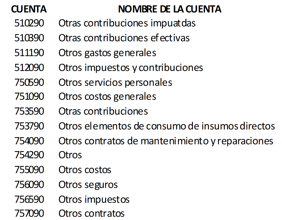 Según lo anterior, es posible que en las cuentas del plan único de cuentas, PUC, que se relacionan en el Anexo 2, haga falta considerar algún tipo de cuenta adicional. En estos casos, entendemos que el transportador puede considerar o incluir las cuentas faltantes, en algunas de las siguientes subcuentas a seis (6) dígitos que aparecen en el formato del Anexo 2.