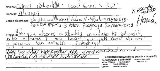 Finalmente, sobre la última parte de su pregunta, no nos fue posible comprender integralmente su contenido, por lo cual la invitamos a formularla nuevamente, enviándola a nuestra dirección de correo electrónico, creg@creg.gov.co o a nuestra dirección de correspondencia, Avenida Calle 116 No. 7-15 Edificio Cusezar interior 2 oficina 901, de la ciudad de Bogotá.