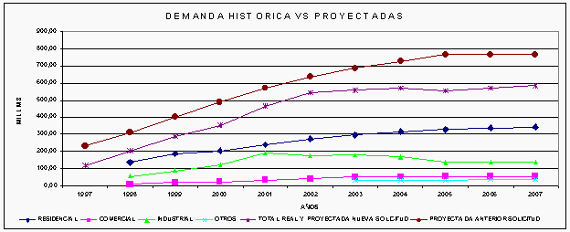Como se puede observar en la serie histórica que se presenta a continuación, la demanda real de la empresa GAS NATURAL S.A. E.S.P. fue inferior a la proyectada en el periodo tarifario anterior, aspecto que incide directamente en el resultado tarifario que hoy se presenta., dado que al calcular tarifas para el nuevo periodo debe realizarse este ajuste. En la gráfica se incluyen las curvas de demanda real y proyectadas para los dos periodos tarifarios.