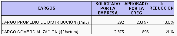 Es de anotar que los cargos solicitados por la empresa eran muy superiores a los aprobados por la CREG. Estos cargos fueron ajustados en un 18% en distribución y en un 20% en comercialización, de acuerdo con la depuración realizada a la información suministrada por la empresa.
