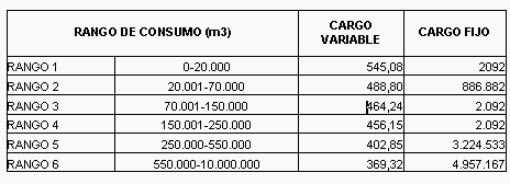 Con base en el Cargo Promedio de Distribución aprobado, la empresa aplicó la metodología de canasta de tarifas definida en la Resolución CREG 011 de 2003 y estableció 6 rangos de consumo, teniendo en cuenta que el primero de ellos no excediera el 10% del cargo promedio de distribución y que el cargo más bajo no fuera menor al costo medio de la red primaria. Es importante precisar que la empresa bajo ciertas condiciones tiene la libertad de diseñar esta canasta tarifaria.
