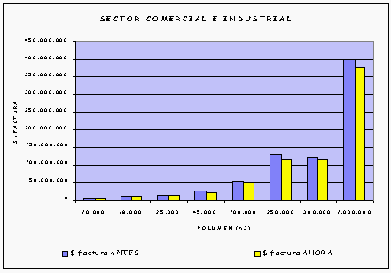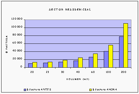 En las gráficas se puede observar, tal y como se comentó anteriormente, que los usuarios residenciales pagan un poco más en sus facturas y los del sector industrial y comercial pagan menos por unidad de consumo (m3), acorde con su estructura de costos.