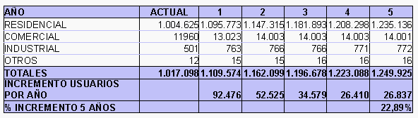 Otro aspecto que influye considerablemente en el incremento de la tarifa es la proyección de demanda de gas natural La tarifa es la relación entre Inversión sobre Demanda; así, a menor demanda mayor tarifa para la misma inversión. para el nuevo periodo tarifario. Estudios realizados por la empresa, muestran que el crecimiento para el sector residencial y comercial de la demanda esperada está alrededor del 16% y 12% respectivamente. No obstante, para el sector industrial, mayor consumidor de este combustible, se prevé un decrecimiento del 22%, esto debido a la mejor competitividad de precios que están alcanzando los otros energéticos sustitutos respecto con los precios del gas natural. De acuerdo con esto, se estimó por parte de la empresa que el crecimiento para el próximo quinquenio sea solo del 4.33%.