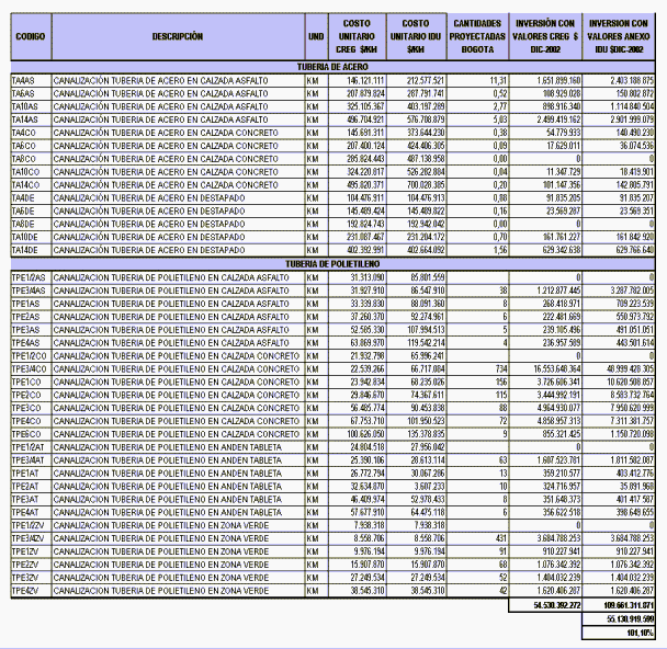 Es importante aclarar que se presentan costos adicionales para las unidades constructivas previstas en las redes proyectadas para la ciudad de Bogotá, en relación con las unidades constructivas típicas para el resto del país. Esto teniendo en cuenta que existe una normatividad Distrital (Anexo IDU 02 -800), la cual establece unas especificaciones técnicas más exigentes a las del resto del país, lo que hace que se incrementen en más de un 100% en promedio, el costo unitario requerido para realizar estas inversiones. Aspecto que afecta directamente a la tarifa de los usuarios.