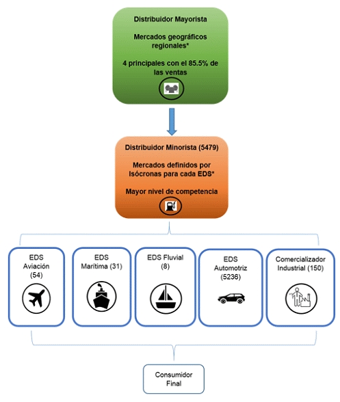 En la cadena de producción de combustibles líquidos derivados del petróleo se identifican 7 etapas, dentro de las que se encuentran: (i) la exploración sísmica; (ii) la exploración perforatoria de los pozos de petróleo; (iii) la producción o extracción de los hidrocarburos a la superficie; (iv) la refinación, para convertir el petróleo en los derivados, como los combustibles; (v) el transporte a los tanques de almacenamiento; (vi) la distribución por parte del mayorista, que entrega el combustible a las EDS; y (vii) la distribución por cuenta del minorista que entrega el combustible a los usuarios finales a través de las EDS.[23]Teniendo en cuenta los eslabones que componen la cadena de producción de combustibles líquidos derivados del petróleo, a continuación se presenta el número de agentes que participan en cada eslabón, desde la fase de refinación hasta la entrega del combustible al consumidor final: