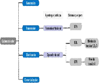 Tal y como se muestra en la figura No. 1 la cadena de valor del servicio de energía eléctrica comprende las siguientes actividades: (i) Generación, que abarca la producción de energía eléctrica, a través del aprovechamiento de fuentes renovables y no renovables; (ii) Transmisión, que comprende el transporte de la energía eléctrica desde las centrales de generación hasta los grandes centros de consumo; (iii) Distribución, que comprende el transporte de energía eléctrica desde el punto en el que el Sistema de Transmisión Nacional la entrega hasta el punto de entrada a las instalaciones del consumidor final, a través de redes, subestaciones y transformadores, y (iv) Comercialización, que abarca la intermediación comercial, a nivel mayorista y minorista, entre los agentes que prestan los servicios de generación, transmisión y distribución de energía eléctrica y los usuarios finales de dichos servicios.