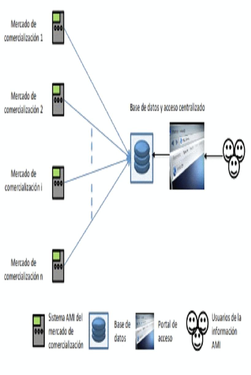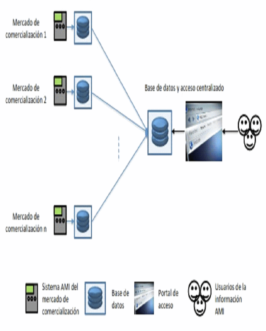 Modelo descentralizado que concentra todas las actividades en un solo responsable, en este caso, al operador de red, se le asigna la responsabilidad de implementar el sistema AMI en cada mercado de comercialización. Esto deriva en información particular de cada OR que estaría disponible en diferentes bases de datos y en diferentes portales web; los usuarios de la información entonces acceden a los datos que consideren de su importancia y no existe una base unificada de información. A continuación, se presenta la gráfica que involucra la opción de implementación 1:
