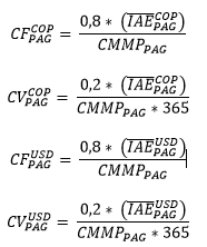 La liquidación de esos cargos se hará de forma mensual con un porcentaje en dólares americanos y un porcentaje en pesos colombianos conforme a la siguiente expresión: