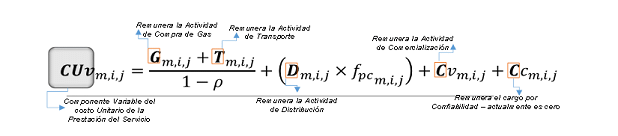 La fórmula que determina el conjunto general de criterios bajo los cuales los comercializadores establecen las tarifas de los usuarios finales, corresponde a la agregación de los costos eficientes de cada una de las actividades de la cadena de gas. La fórmula tarifaria está definida así: