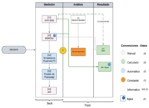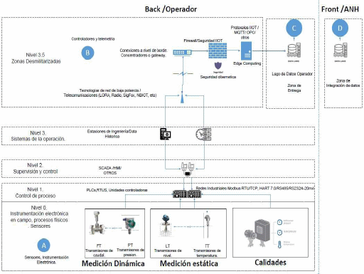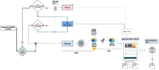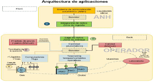 C. En la Figura 5, se describe la arquitectura de las aplicaciones para la fiscalización de hidrocarburos, donde el flujo de los datos entre el operador y la Agencia Nacional de Hidrocarburos (ANH), se recopilan en el operador a través de: (i) computadores de flujo, que miden variables de líquidos y gas; (ii) telemetría de tanques, que registra datos volumétricos automatizados (Puntos de Medición Oficiales - PMO); (iii) pruebas manuales, como las de pozos y paros; (iv) calidad del crudo y gas, cuyos parámetros como BSW, API, y contenido de sal y azufre se analizan en laboratorio. Estos datos se almacenan en la base de datos del operador, que consolida la información de cantidad (instrumentada) y calidad (manual). Luego, se transmiten al sistema de la ANH a través de un proceso de ingesta de datos.