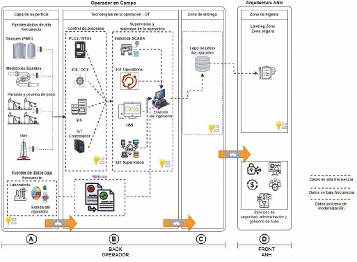 La zona de ingesta, en la Figura 7 es “el punto D”, la cual es la infraestructura tecnológica dispuesta por la ANH, donde recibirá o halará la información por parte del operador, para su extracción, transformación y almacenamiento.