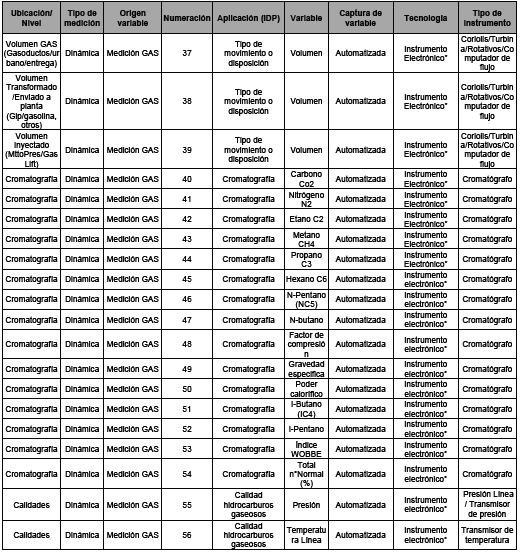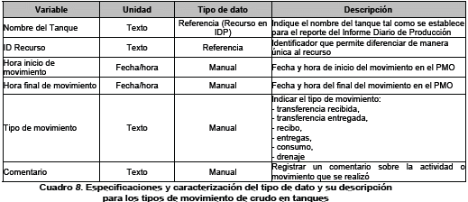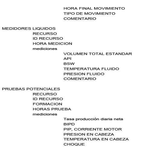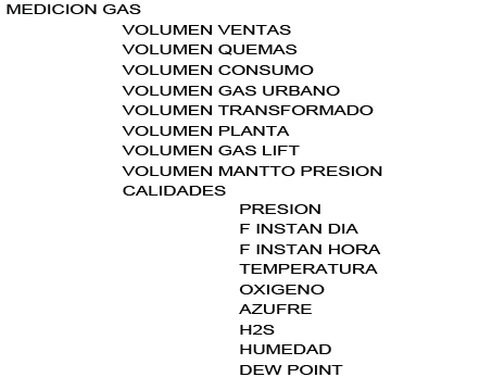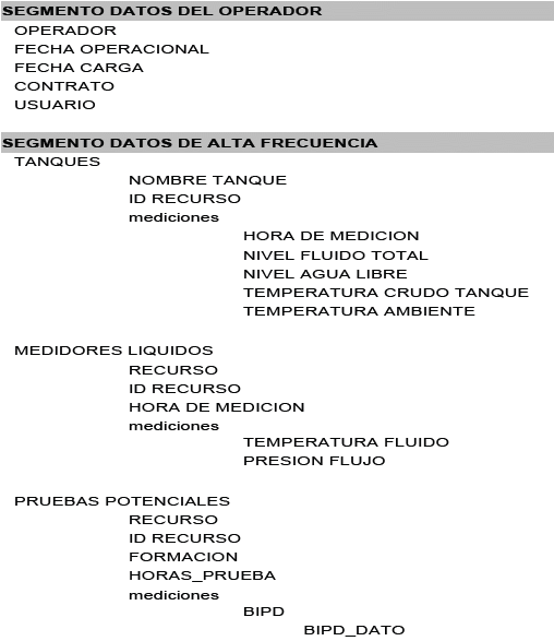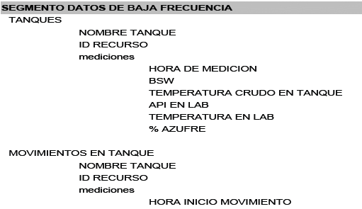 - El segundo segmento contiene cinco agrupaciones, o arreglos de datos, para el registro de: información en tanques, movimientos en tanques, medidores líquidos, medidores de gas, pruebas potenciales de pozo y paradas de pozo.