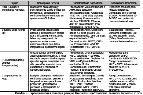 En el Cuadro 5 se presentan las especificaciones mínimas para las Unidades Controladoras, remotas, locales o in situ, sugeridas con las características mínimas de procesamiento, alimentación eléctrica y adquisición del dato.