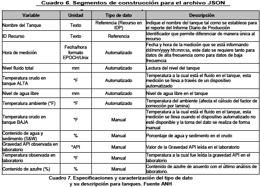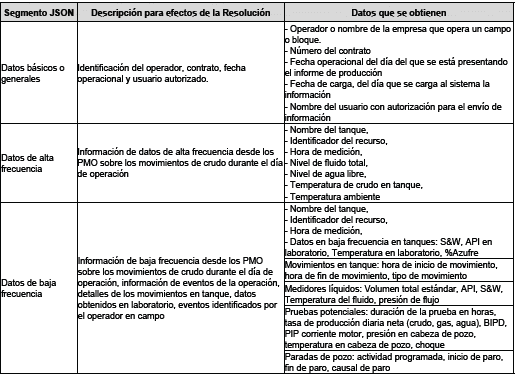ARTÍCULO 15. ENTREGA DE INFORMACIÓN MEDIANTE ARCHIVO JSON A LA ANH. A más tardar a las 7:00 a. m, se deberá remitir el archivo JSON a la ANH con los resultados de las operaciones del día anterior con corte a las 23:59:59, la medición de calidad y cantidad de los fluidos producidos.