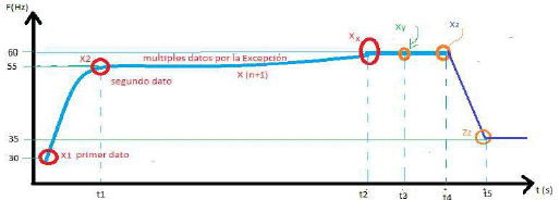 Por ejemplo, la frecuencia de una bomba electro sumergible, tiene una frecuencia de arranque de 30 Hz y con el paso del tiempo presenta cambios desde X1 a X2, donde la frecuencia pasa de 30 Hz a 55 Hz, logrando una estabilidad gradual de X2 a Xx, donde Xx permanece estable en el tiempo hasta Xz.
