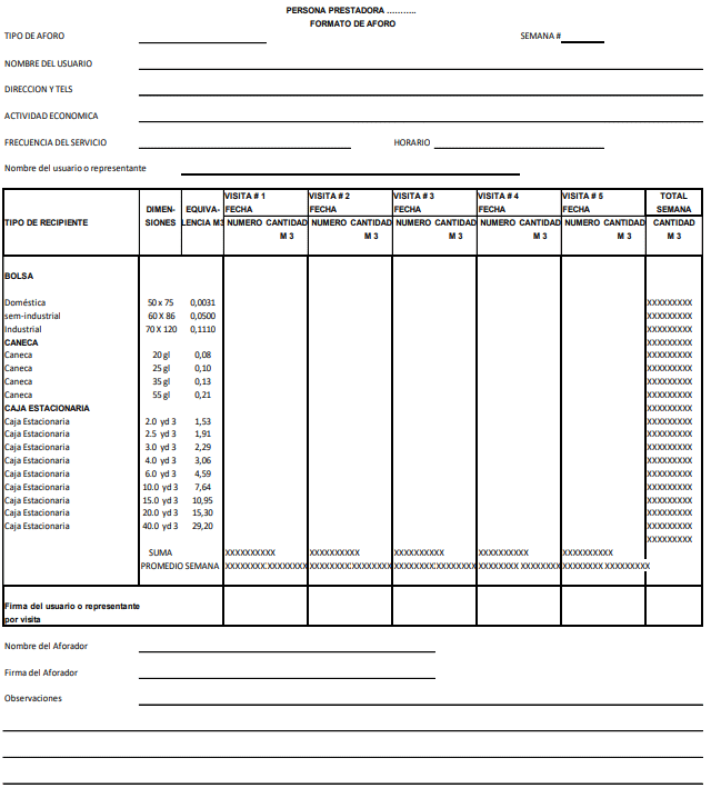 Formato de aforo. Es el documento en el cual en cada una de las visitas efectuadas para medición o aforo se registran, entre otros, los siguientes datos: nombre de la persona prestadora, nombre del usuario, fecha en la que se realiza la toma del dato puntual, los tipos de recipientes en los cuales se presentan los residuos, el dato puntual, la conversión en metros cúbicos, nombre y firma del aforador y del usuario o el testigo.