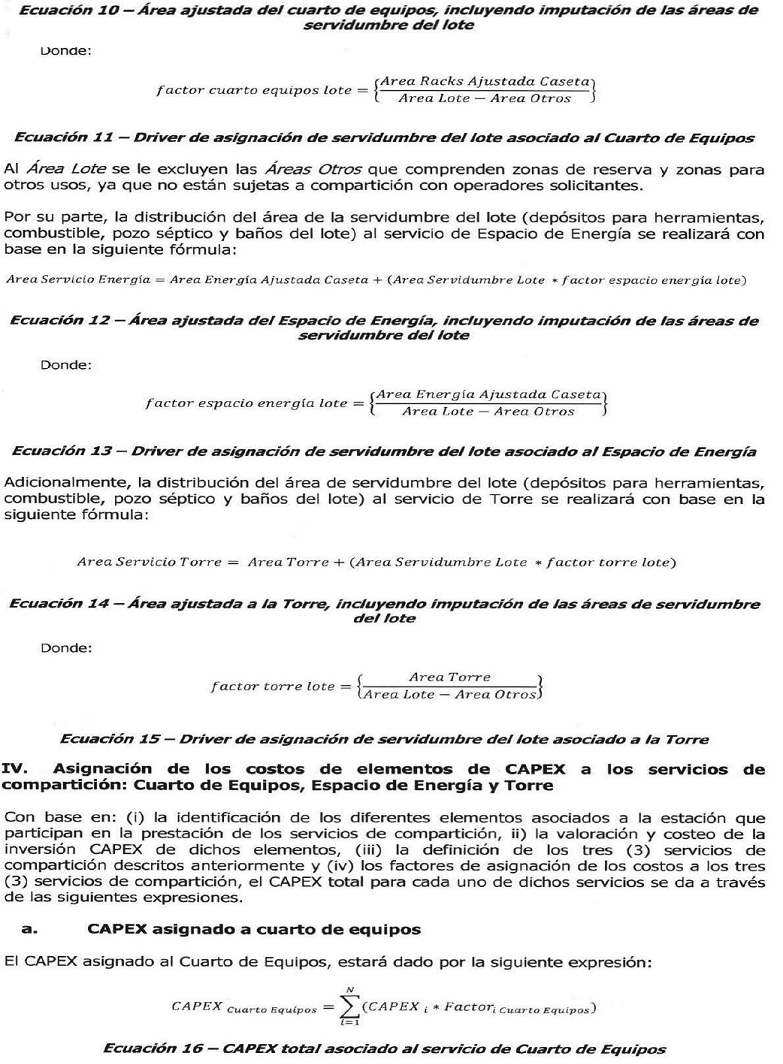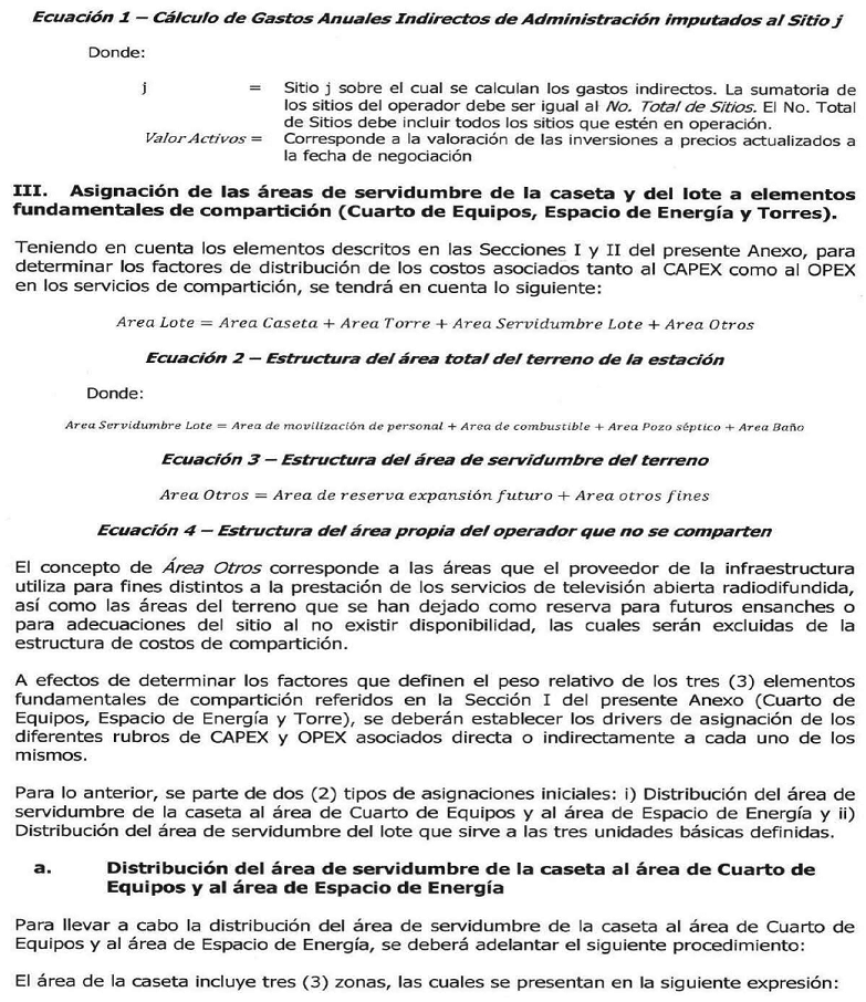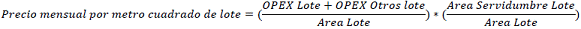 | OPEX Otros lote = | Expresado en pesos por mes, correspondiente a los costos mensuales de operación y mantenimiento OPEX asociados exclusivamente al espacio que esté incluido en el Área Servidumbre Lote y sobre el cual no exista infraestructura alguna relacionada con la compartición de los servicios de Cuarto de Equipos, de Espacio de Energía y de Torre”. |