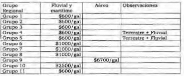 En dicho anexo se establece, entre otros, que para determinar el costo de transporte de combustible en medio marítimo, fluvial y aéreo, se reconocerá el costo adicional que se indica en la Tabla 6 para cada grupo regional, considerando un costo desde el centro de abasto más cercano hasta las principales cabeceras municipales del grupo regional. Así mismo, a partir de estas cabeceras municipales se reconocerá adicionalmente un costo de $200/gal para transporte marítimo y fluvial hacia las áreas rurales de cada municipio (corregimientos, inspecciones y caseríos).