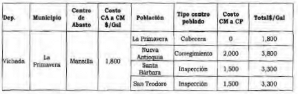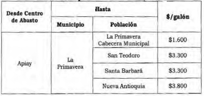 Según lo previsto en la tabla 6, para el grupo 4 ya se encuentra incluido dentro del costo de transporte la porción terrestre y, en consecuencia, el costo de transporte hasta la cabecera municipal de La Primavera corresponde a $600/gal (pesos de diciembre de 2006) y hasta las poblaciones de Santa Bárbara, Nueva Antioquia y San Teodoro a $200/gal adicionales, es decir un total de $800/gal (pesos de diciembre de 2006), que a pesos de junio de 2019 equivalen a $1.004,79/gal y $ 1.339,72/gal, respectivamente.