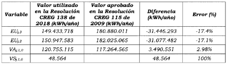 Tabla 1. Diferencias entre la información de Energía Útil y ventas utilizadas para la aprobación de los cargos de la Resolución CREG 115 de 2009 y las utilizadas por la CREG en la resolución CREG 138 de 2019.