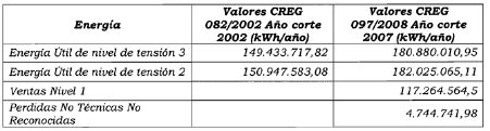 Tabla 3. Energías útiles registradas en el aplicativo CREG, empleadas en el cálculo de los cargos de distribución aprobados en la Resolución CREG 115 de 2009.