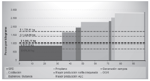 Como lo ha expresado Ecopetrol, y se ha analizado previamente en este documento, el GLP producido en las refinerías de Barrancabermeja y Cartagena puede ser exportado o, algunas de sus corrientes y en particular el propileno, pueden ser suministradas a la industria petroquímica. En cuanto al GLP de Apiay, dada su situación geográfica, el costo de oportunidad es el precio máximo al que pueda suministrarlo en el mercado del interior.