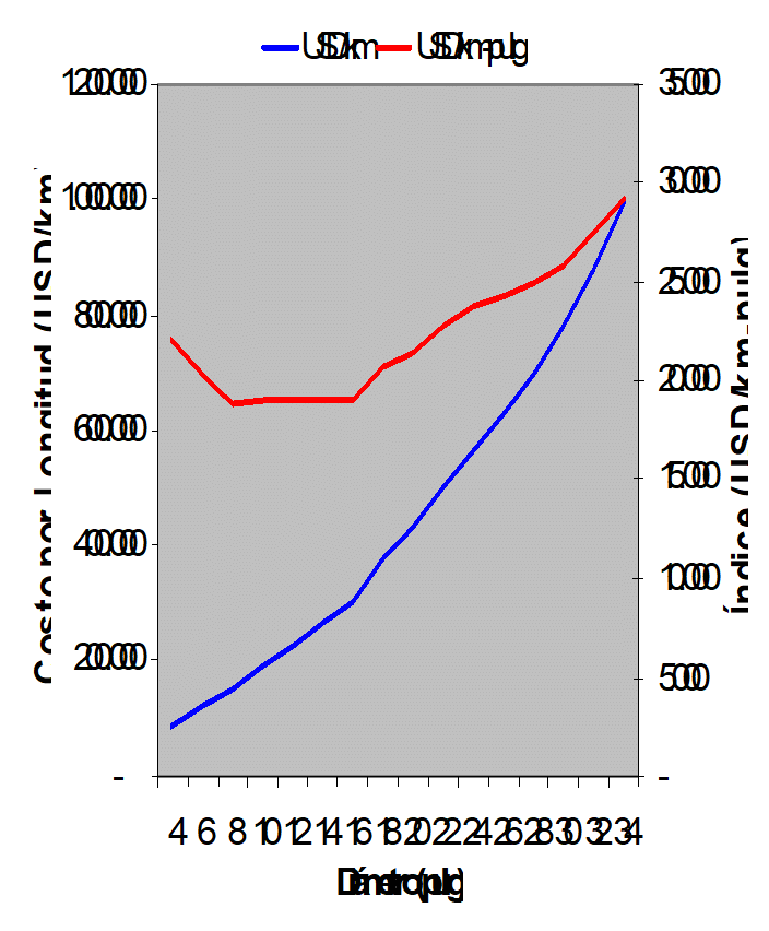 Así las cosas, se ha considerado que los costos de un proyecto de construcción de un gasoducto están directamente relacionados con la longitud, el diámetro y el espesor de la tubería, razón por la cual se utiliza para efectos de comparación un indicador de inversión que se expresa en US$/km-pulg. La siguiente gráfica se construyó con base en datos teóricos, tomados de “Pipeline Rules of Thumb Handbook”, que determinan el porcentaje de cambio de los costos cuando se pasa de un diámetro a otro, tomando como referencia el costo del gasoducto Barrancabermeja – Payoa, construido por Transoriente S.A. ESP (59 km en tubería de acero de 8 pulgadas).