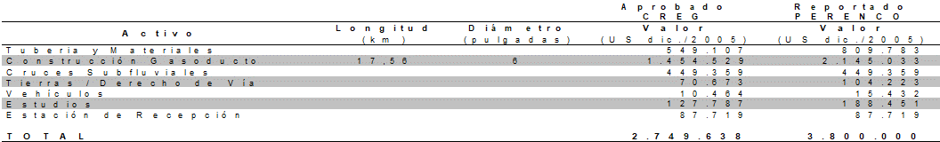 Para los rubros “Cruces Subfluviales” y “Estación de Recepción” se tomaron los valores reportados por PERENCO COLOMBIA LIMITED, teniendo en cuenta que estos corresponden a costos que son particulares del proyecto. En la siguiente tabla se presenta la comparación de los valores reportados en la solicitud tarifaria y los aprobados por la CREG.
