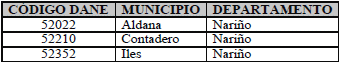 | CÓDIGO DANE | MUNICIPIO | DEPARTAMENTO |
