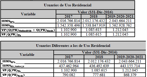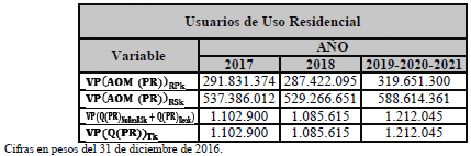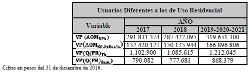 Aplicando la metodología contenida en la Resolución CREG 202 de 2013 y sus modificaciones y adiciones, se calcularon conforme a las formulas establecidas en los numerales 9.1.1.3 y 9.2.1.3 del artículo 9o para la componente que remunera los gastos de AOM, aplicable a usuarios de uso residencial y a usuarios diferentes a los de uso residencial, las siguientes variables principales: