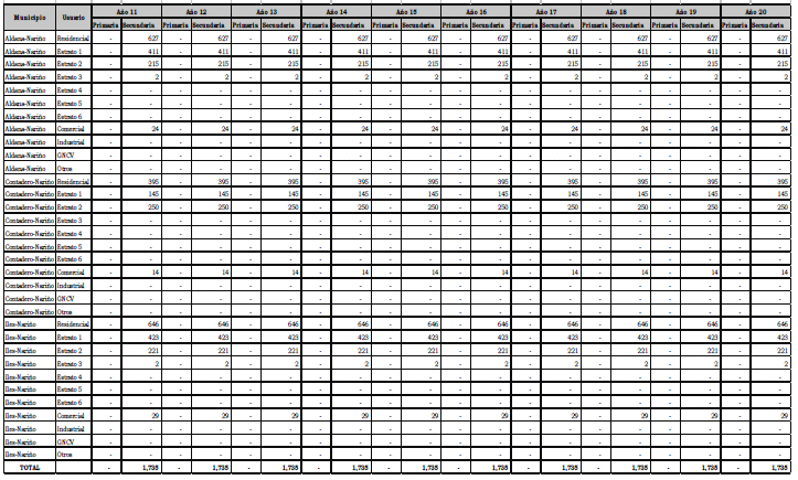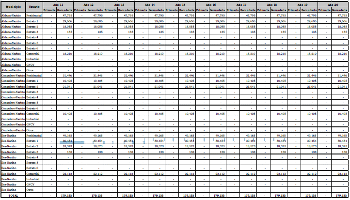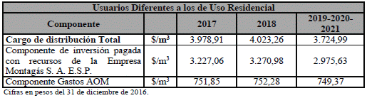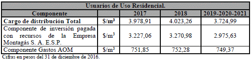 Dado que el sistema de distribución presentado por la Empresa Montagás S. A. E.S.P., para el mercado relevante conformado por los municipios de Aldana, Contadero e Iles en el departamento de Nariño, cuenta con red primaria y secundaria y todos sus usuarios están conectados a la red secundaria, se podrá determinar para este mercado relevante un solo cargo de distribución que será aplicable a los usuarios de uso residencial y usuarios diferentes al uso residencial.
