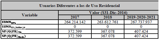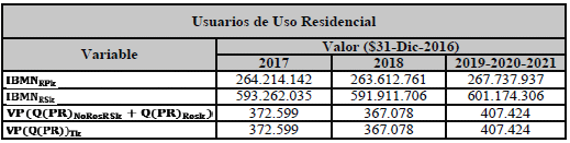 Aplicando la metodología contenida en la Resolución CREG 202 de 2013 y sus modificaciones y adiciones, se calcularon conforme a las formulas establecidas en los numerales 9.1.1.3. y 9.2.1.3. del artículo 9o para la componente que remunera la inversión base, aplicable a usuarios de uso residencial y a usuarios diferentes a los de uso residencial y se obtuvieron las siguientes variables principales: