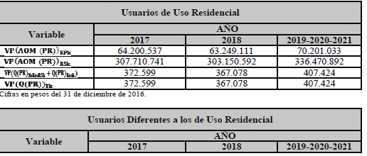 Aplicando la metodología contenida en la Resolución CREG 202 de 2013 y sus modificaciones y adiciones, se calcularon conforme a las formulas establecidas en los numerales 9.1.1.3. y 9.2.1.3 del artículo 9o para la componente que remunera los gastos de AOM, aplicable a usuarios de uso residencial y a usuarios diferentes a los de uso residencial, las siguientes variables principales: