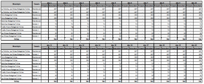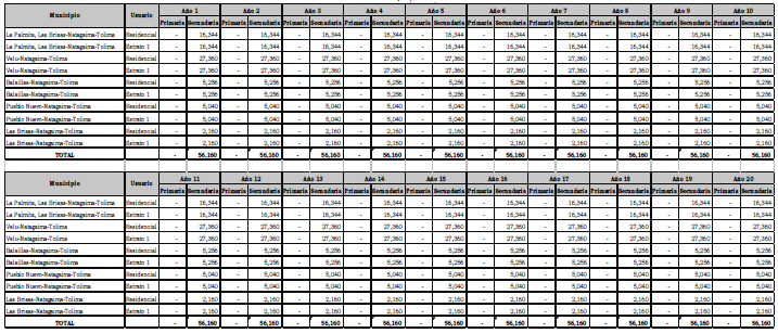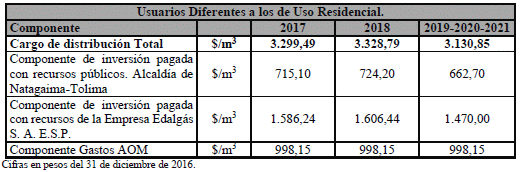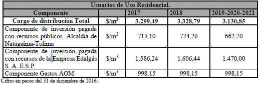 Dado que el sistema de distribución presentado por la Empresa Edalgas S. A. E.S.P. para el mercado relevante especial conformado por los centros poblados de Balsillas, La Palmita, Las Brisas, Pueblo Nuevo y Velú, perteneciente al municipio de Natagaima, departamento de Tolima, cuenta con red primaria y secundaria y todos sus usuarios están conectados a la red secundaria, se podrá determinar para este mercado relevante un solo cargo de distribución que será aplicable a los usuarios de uso residencial y usuarios diferentes al uso residencial.