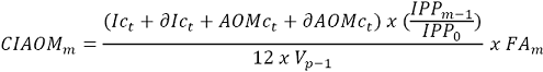 | CIAOMm: | Precio máximo regulado compuesto por los costos de inversión y los gastos de administración, operación y mantenimiento en comercialización, para el mes m. Este valor, expresado en pesos por kilovatio hora ($/kWh), se estimará así: |