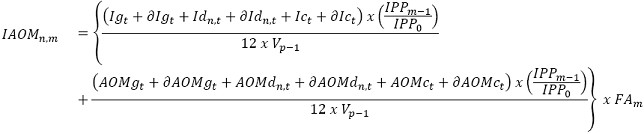 | IAOMcm: | Precio regulado para el mes m del periodo de vigencia de la obligación de prestación del servicio, que remunera al prestador del servicio las inversiones y los gastos de administración, operación y mantenimiento requeridos para la actividad de comercialización. Este precio, expresado en pesos por kilovatio hora ($/kWh) del mes anterior al de la realización del proceso competitivo, será el ofertado por el adjudicatario de la obligación de prestación del servicio en la propuesta que presente en dicho proceso. |