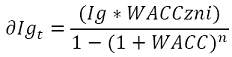 | Igt: | Ingreso regulado para el año t del periodo de vigencia de la obligación de prestación del servicio, que remunera las inversiones requeridas para la actividad de generación. Este ingreso, expresado en pesos ($) del mes anterior al de la realización del proceso competitivo, corresponderá a las inversiones en generación realizadas por el adjudicatario para atender la demanda máxima proyectada y será el ofertado por el adjudicatario de la obligación de prestación del servicio en la propuesta que presente en el proceso competitivo. Este valor podrá incrementarse en caso de que sea necesario hacer nuevas inversiones para atender la demanda adicional que haga que la demanda real supere la demanda límite establecida por el adjudicatario quien deberá acometer tales nuevas inversiones mediante un proceso competitivo. |