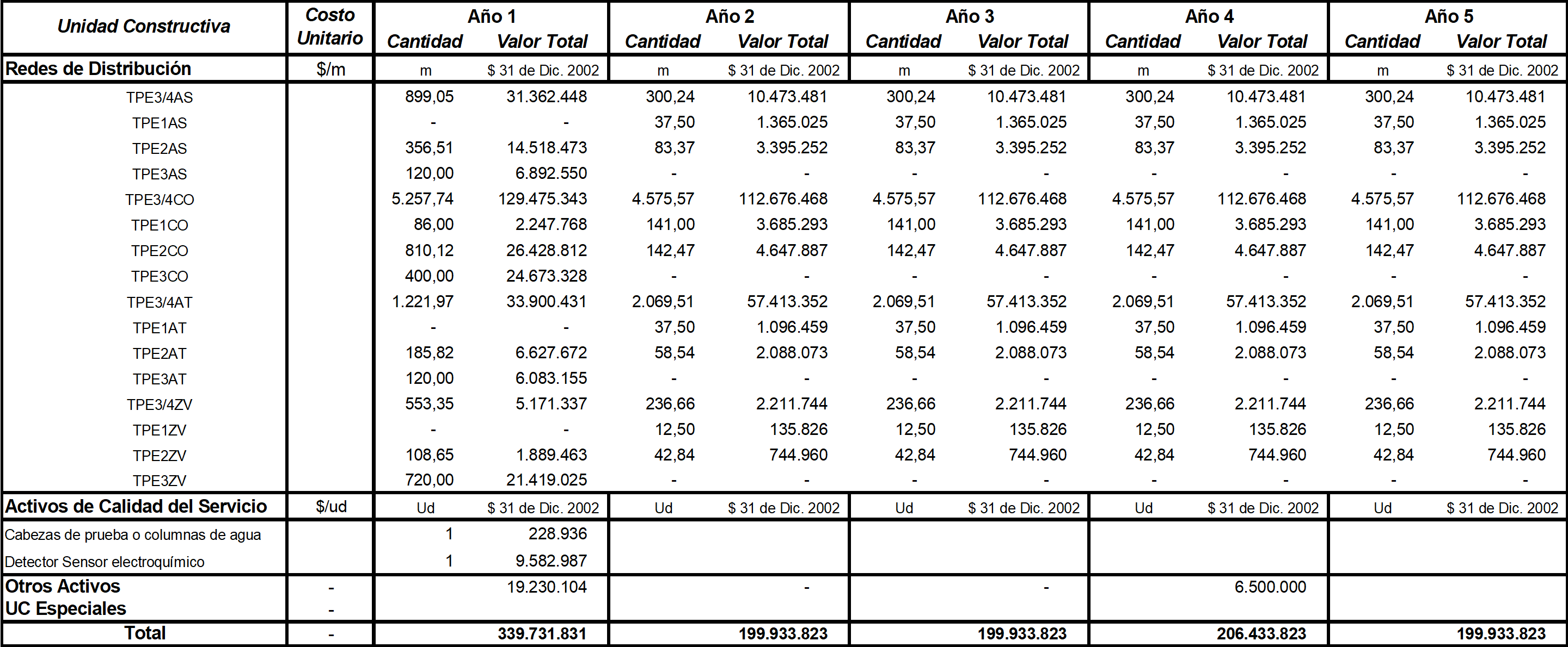 | Componente | $ del 31 de Dic/2002 |