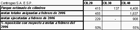 La metas totales asignadas a la sociedad CENTROGAS S.A. E.S.P. a febrero del 2006 son 455 Cilindros de 20 libras y 1.637 cilindros de 40 libras de las cuales la empresa ha repuesto a febrero del 2006, 229 cilindros de 20 libras y 908 de 40 libras respectivamente. Lo anterior corresponde al 50% de reposición de cilindros de 20 libras y al 55% de reposición de cilindros de 40 libras a febrero del 2006.